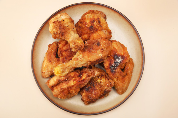 6. Transfer the chicken to the reserved paper bag (or paper towels) to drain and repeat cooking the remaining chicken, allowing the oil to return to 375 degrees before frying. While the cooked chicken is still wet with hot oil, sprinkle it with some of the garlic-salt mixture, then let cool for 10 minutes before serving.