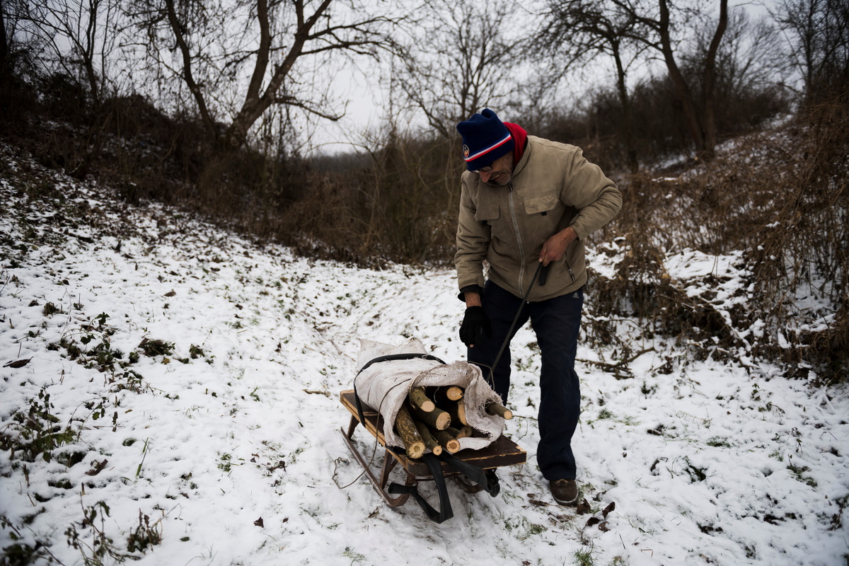 Bela Varga, 53, drags firewood that he collected from trees on a sledge in Sajonemeti, Hungary, January 19, 2021. REUTERS/Marton Monus