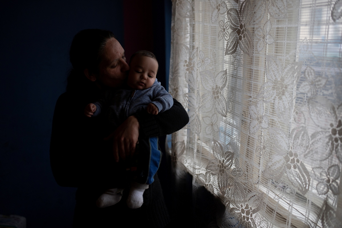 Renata Horvat smokes a cigarette as she holds her son Manasse Berki in Ozd, Hungary, January 19, 2021. REUTERS/Marton Monus