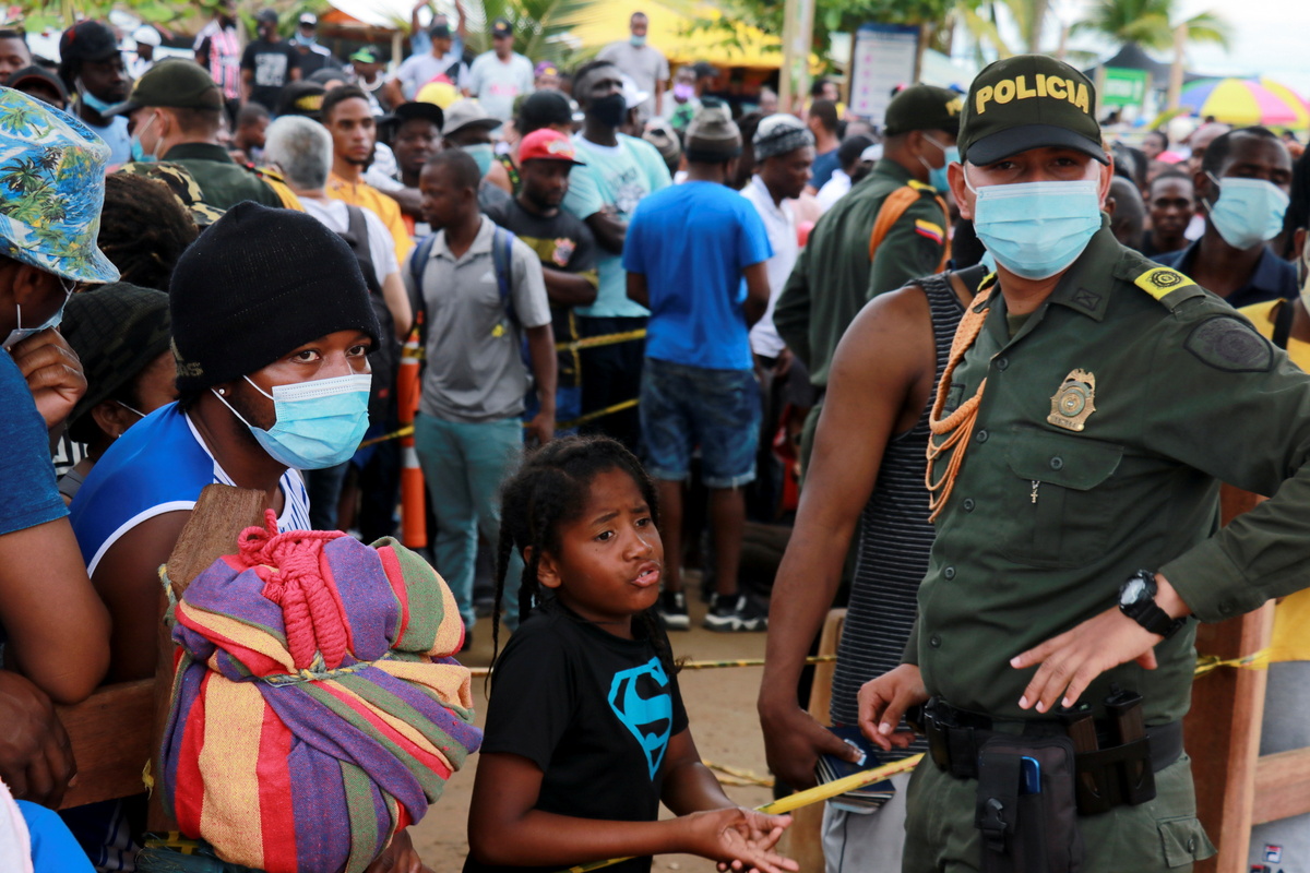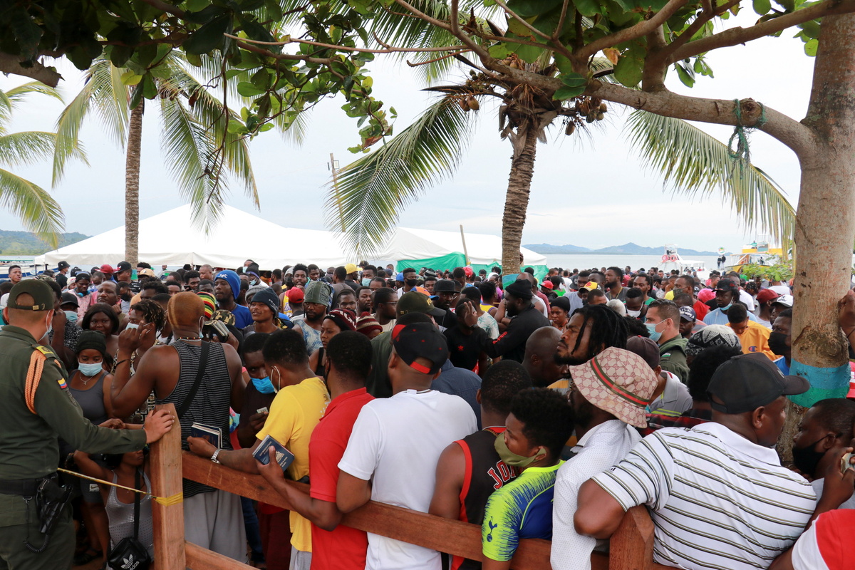 Some 14,000 migrants - many of them Haitian - remain bottle-necked in the Colombian beach town of Necocli, awaiting their chance to enter Panama and continue their journey to the United States, as border crossing quotas are out-paced by new arrivals, migrants and the town's mayor said.