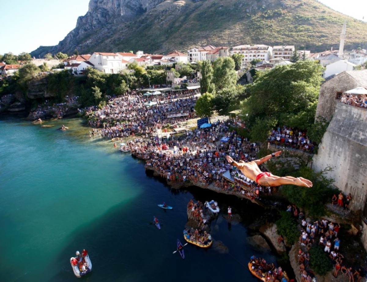 The picturesque town has become famous for the diving competition from the white bridge, rebuilt in 2004 and a symbol of reconciliation after it was destroyed by Bosnian Croat artillery in 1993 during the Bosnian war.