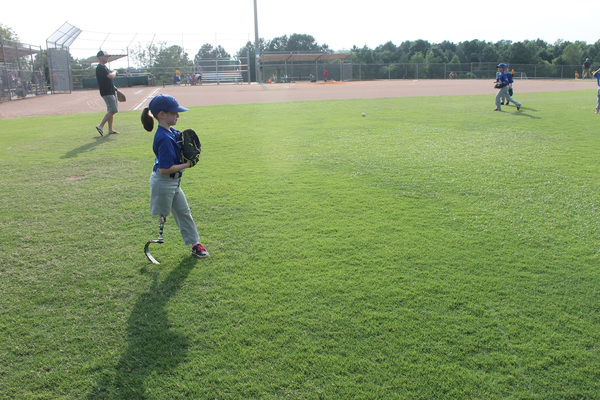 But 6-year-old Rosie is missing her left forearm and entire right leg. To play T-ball, she wears a prosthetic leg suited for running. Her prosthetic arm, although she doesn't wear it on the field, matches the blue of her jersey.