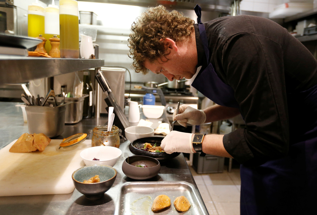 Simon Carlier, Chef of "Solides" restaurant, prepares a dish with a "naturally fatty" foie gras, produced without gavage made from geese fed with bacteria to stimulate the fattening of the liver, avoiding force-feeding geese that is criticized by animal welfare activists, at a restaurant in Toulouse, France, November 29, 2019. REUTERS/Regis Duvignau