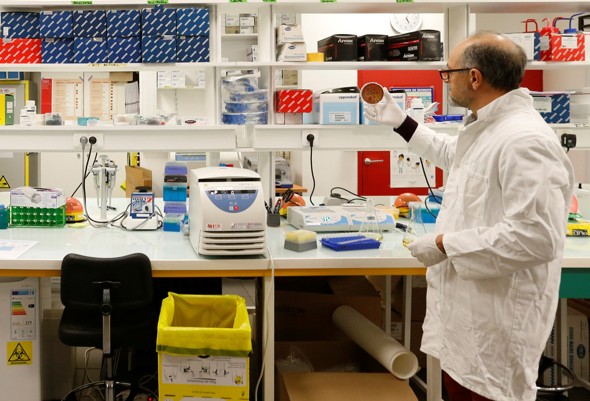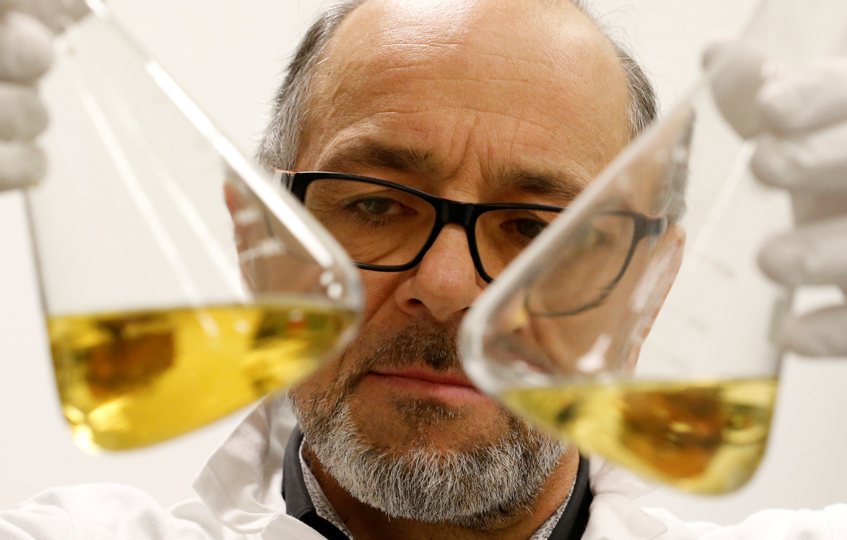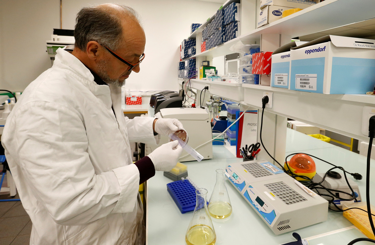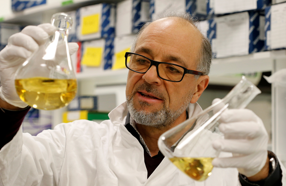 French scientist Remy Burcelin, who discovered the process to produce "naturally-fat" foie gras, checks samples of intestinal bacteria culture to make serum which is introduced to baby geese to stimulate fat growth in liver, as he works in his research laboratory in Labege, France, December 2, 2019. REUTERS/Regis Duvignau