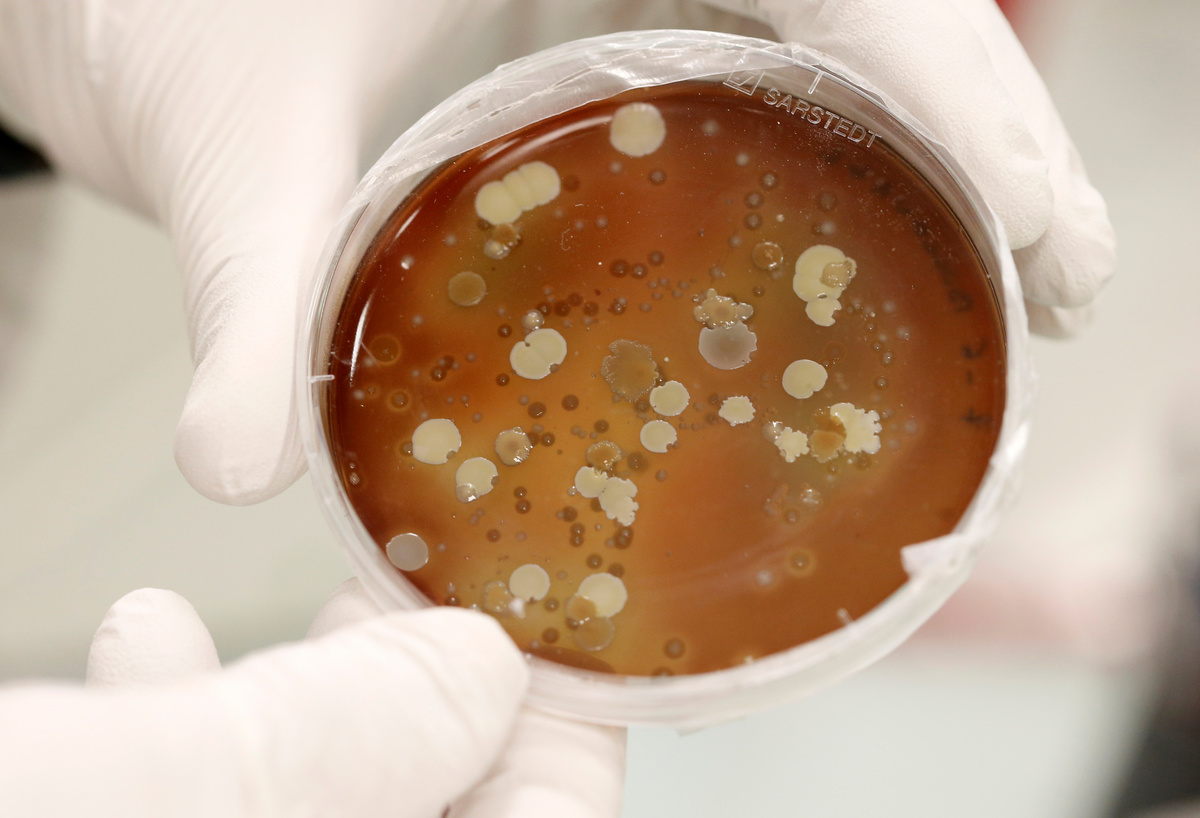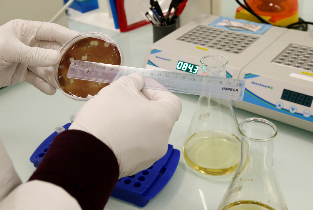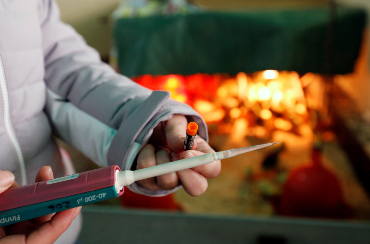 French scientist Remy Burcelin, who discovered the process to produce "naturally-fat" foie gras, checks samples of intestinal bacteria culture to make serum which is introduced to baby geese to stimulate fat growth in liver, as he works in his research laboratory in Labege, France, December 2, 2019. REUTERS/Regis Duvignau