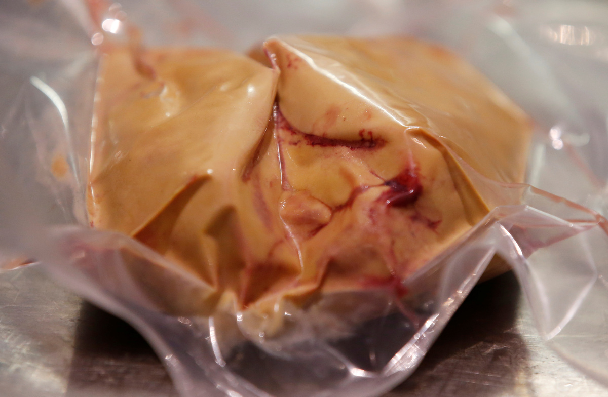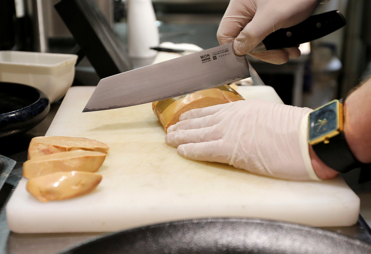 Simon Carlier, Chef of "Solides" restaurant, cuts a "naturally fatty" foie gras, produced without gavage made from geese fed with bacteria to stimulate the fattening of the liver, avoiding force-feeding geese that is criticized by animal welfare activists, at a restaurant in Toulouse, France, November 29, 2019. REUTERS/Regis DuvignauFrench scientist Remy Burcelin, who discovered the process to produce "naturally-fat" foie gras, looks at samples of intestinal bacteria culture to make serum which is introduced to baby geese to stimulate fat growth in liver, as he works in his research laboratory in Labege, France, December 2, 2019. REUTERS/Regis DuvignauFrench scientist Remy Burcelin, who discovered the process to produce "naturally-fat" foie gras, checks samples of intestinal bacteria culture to make serum which is introduced to baby geese to stimulate fat growth in liver, as he works in his research laboratory in Labege, France, December 2, 2019. REUTERS/Regis DuvignauFrench scientist Remy Burcelin, who discovered the process to produce "naturally-fat" foie gras, checks samples of intestinal bacteria culture to make serum which is introduced to baby geese to stimulate fat growth in liver, as he works in his research laboratory in Labege, France, December 2, 2019. REUTERS/Regis DuvignauFrench scientist Remy Burcelin, who discovered the process to produce "naturally-fat" foie gras, checks serum which is introduced to baby geese to stimulate fat growth in liver, as he works in his research laboratory in Labege, France, December 2, 2019. REUTERS/Regis DuvignauA geese grower farmer holds a pipette with a dose of serum containing the bacteria to stimulate fat growth in liver to a two-day-old goslings to produce a "naturally fatty" foie gras, in Bazillac, France, December 3, 2019. REUTERS/Regis DuvignauA geese grower farmer gives a dose of serum containing the bacteria to stimulate fat growth in liver to a two-day-old gosling to produce a "naturally fatty" foie gras, in Bazillac, France, December 3, 2019. REUTERS/Regis DuvignauA geese grower farmer holds a two-day-old gosling before being fed with a dose of serum containing the bacteria to stimulate fat growth in liver to produce a "naturally fatty" foie gras, in Bazillac, France, December 3, 2019. REUTERS/Regis DuvignauA "naturally fatty" foie gras, produced without gavage made from geese fed with bacteria to stimulate the fattening of the liver, avoiding force-feeding geese that is criticized by animal welfare activists, is pictured in a restaurant in Toulouse, France, November 29, 2019. REUTERS/Regis DuvignauA "naturally fatty" foie gras, produced without gavage made from geese fed with bacteria to stimulate the fattening of the liver, avoiding force-feeding geese that is criticized by animal welfare activists, is pictured in a restaurant in Toulouse, France, November 29, 2019. REUTERS/Regis DuvignauSimon Carlier, Chef of "Solides" restaurant, prepares a dish with a "naturally fatty" foie gras, produced without gavage made from geese fed with bacteria to stimulate the fattening of the liver, avoiding force-feeding geese that is criticized by animal welfare activists, at a restaurant in Toulouse, France, November 29, 2019. REUTERS/Regis Duvignau