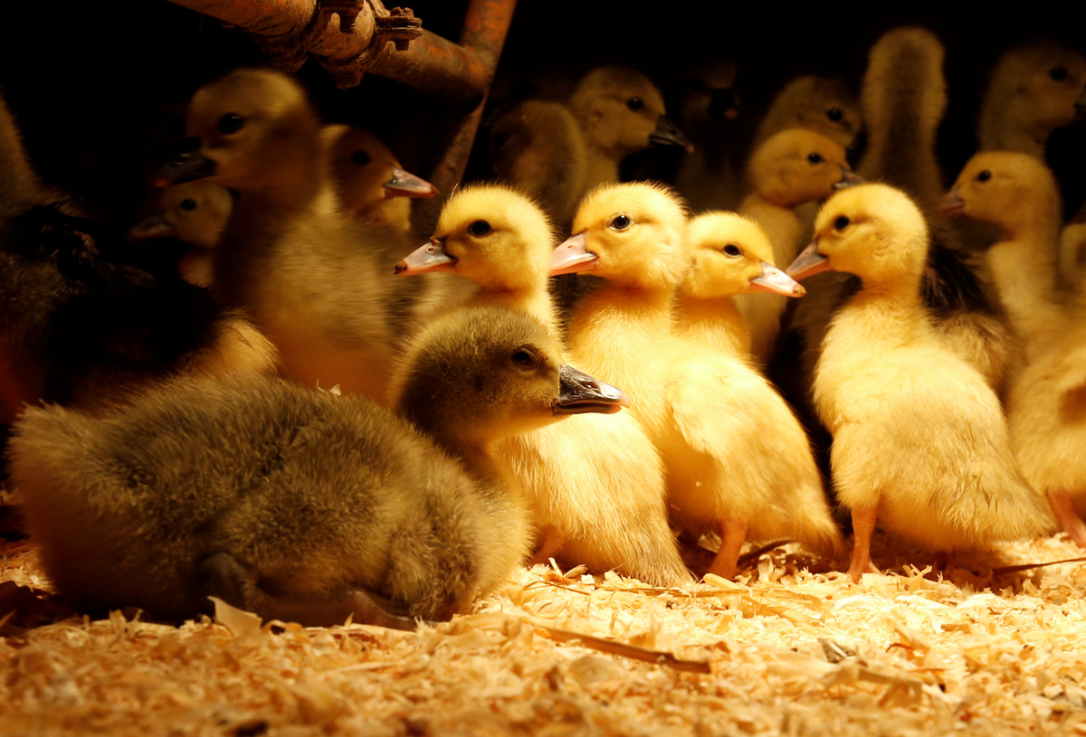 Two-day-old goslings are seen before being fed with a dose of serum containing the bacteria to stimulate fat growth in liver to produce a "naturally fatty" foie gras, in Bazillac, France, December 3, 2019. REUTERS/Regis Duvignau