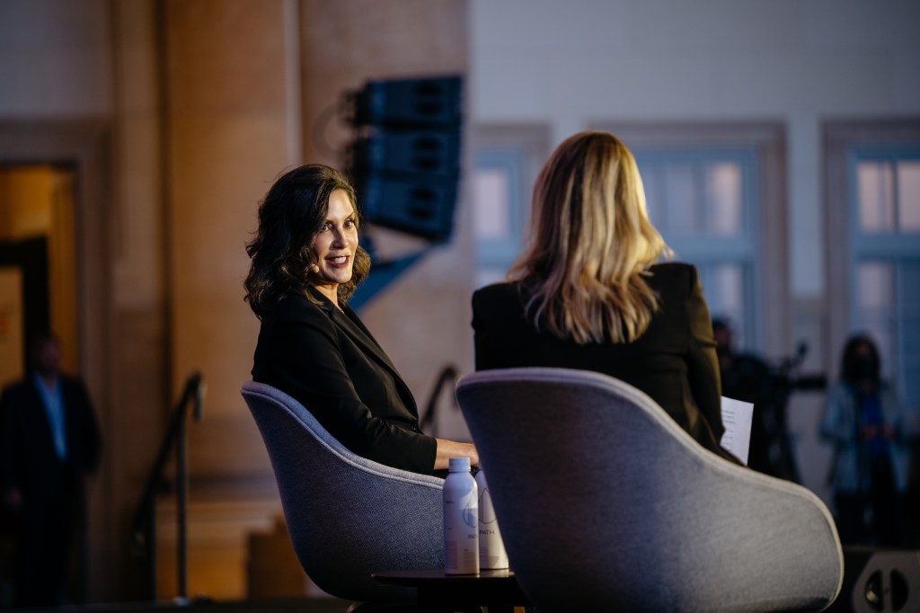 When asked about tariffs and their impact on Michigan, Whitmer said she’s “not against all tariffs per se” but repeated the saying “When America catches the cold, Michigan gets the flu” and raised the story of her driver named Eric. He owned three trucks and had his own trucking company, she said, but he “had to walk away from the business because of tariffs. People were too uncertain. They weren’t shipping at a rate that he could stay in business.”