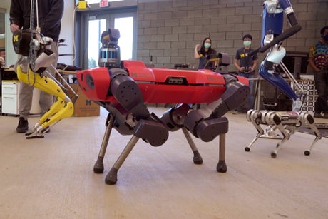 Digit marches on two legs across the floor of the University of Michigan’s Ford Motor Co. Robotics Building, while Mini-Cheetah — staccato-like — does the same on four and the yellow-legged Cassie steps deliberately side-to-side.