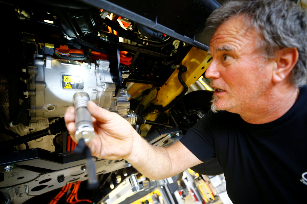 The cockpit and steering wheel of a Streetscooter WORK XL electric van based on a Ford Transit is pictured at Ford's new production line in Cologne, Germany October 9, 2018. REUTERS/Wolfgang RattayA worker of Ford Germany points his torch at the electric engine of a StreetScooter WORK XL electric van based on a Ford Transit at Ford's new production line in Cologne, Germany October 9, 2018. REUTERS/Wolfgang RattayA worker of Ford Germany checks the engine of a StreetScooter WORK XL electric van based on a Ford Transit at Ford's new production line in Cologne, Germany October 9, 2018. REUTERS/Wolfgang RattayA worker of Ford Germany checks the engine of a StreetScooter WORK XL electric van based on a Ford Transit at Ford's new production line in Cologne, Germany October 9, 2018. REUTERS/Wolfgang Rattay
