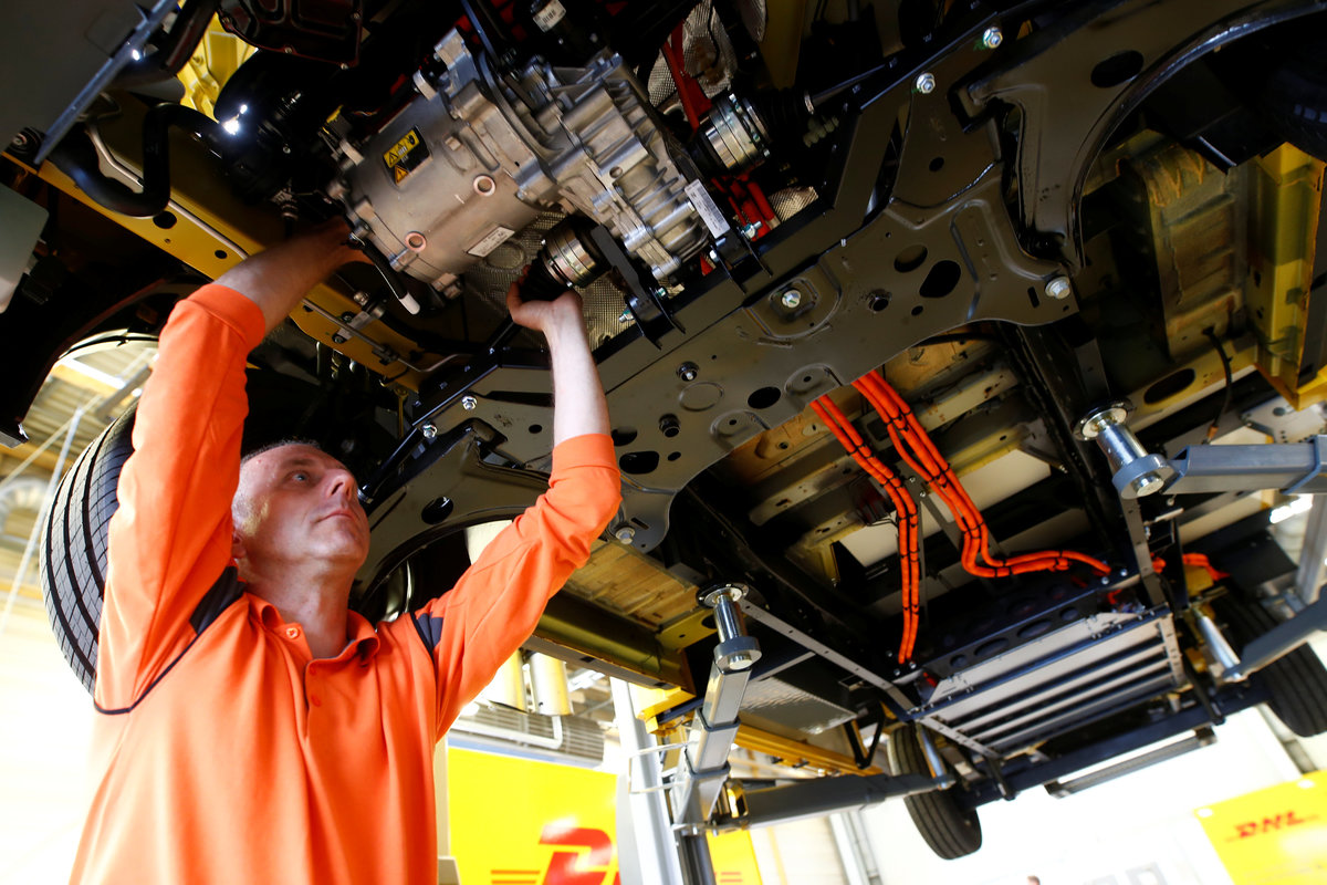 A worker of Ford Germany checks a Streetscooter WORK XL electric van based on a Ford Transit at Ford's new manufacturing line in Cologne, Germany October 9, 2018. REUTERS/Wolfgang Rattay