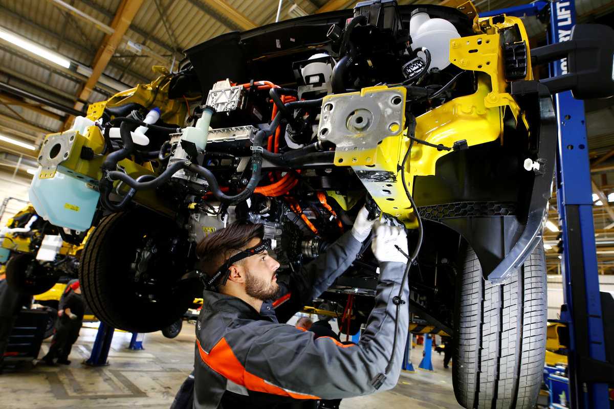 A worker of Ford Germany fixes the engine of a Streetscooter WORK XL electric van based on a Ford Transit at Ford's new manufacturing line in Cologne, Germany October 9, 2018. REUTERS/Wolfgang Rattay