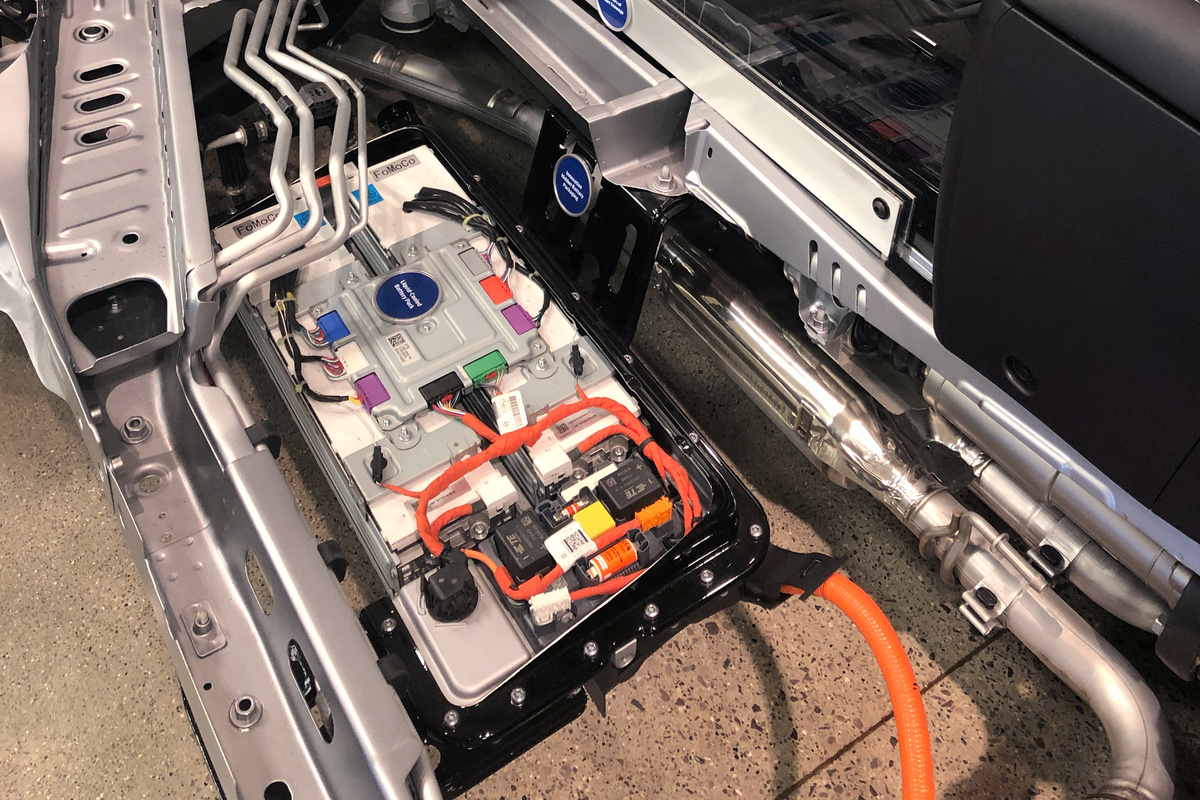 The battery pack for the 2020 Escape's hybrid system, launching this fall, fits under the floor, instead of hogging space in the rear cargo compartment, as in prior Escape hybrids. The 2020 battery pack, built by Ford, is less than half the size of the older one.