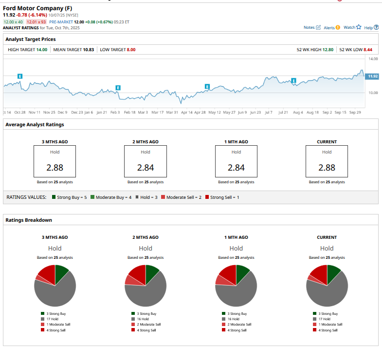 That said, Ford’s strong Q3 delivery performance is not lost on brokerages, and UBS and Wells Fargo have raised the stock’s target price this month. Jefferies went a step further and upgraded the stock from an “Underperform” to “Hold” while raising its target price from $9 to $12. However, Ford has a consensus rating of “Hold” from the 25 analysts tracked by Barchart, and the stock trades above its mean target price of $10.83.