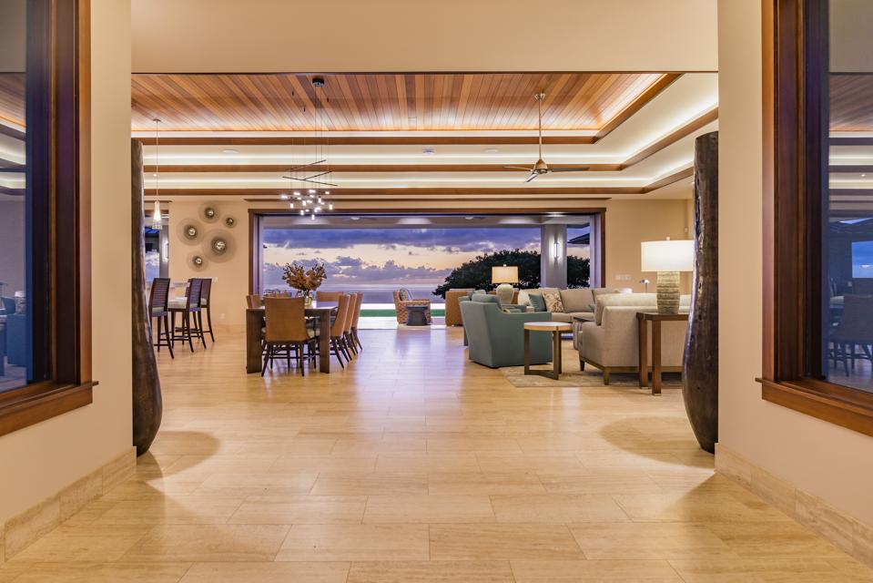 The furnished four-bedroom, 4.5-bathroom home with more than 7,000 square feet of space features wood paneling and built-in cabinet screens. An outdoor covered lanai overlooks an infinity pool and the ocean beyond.
