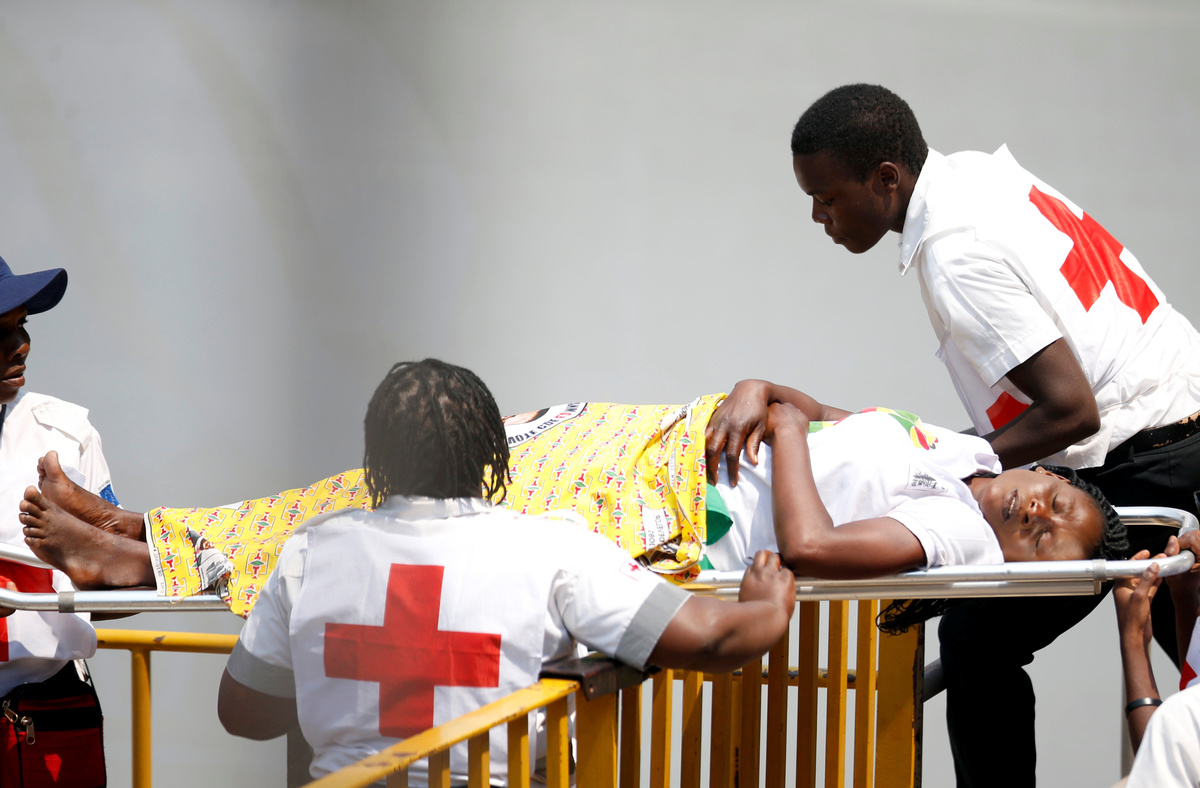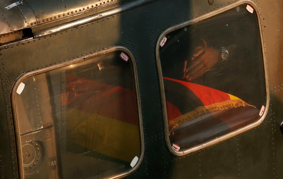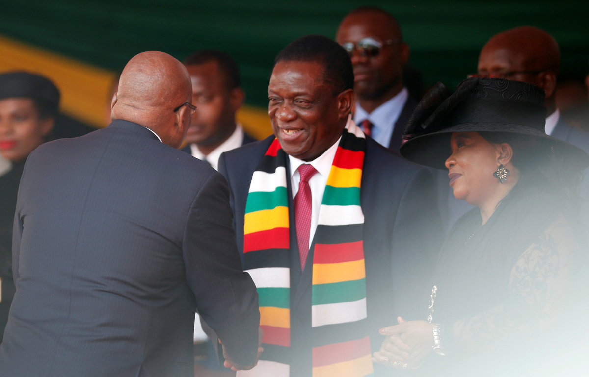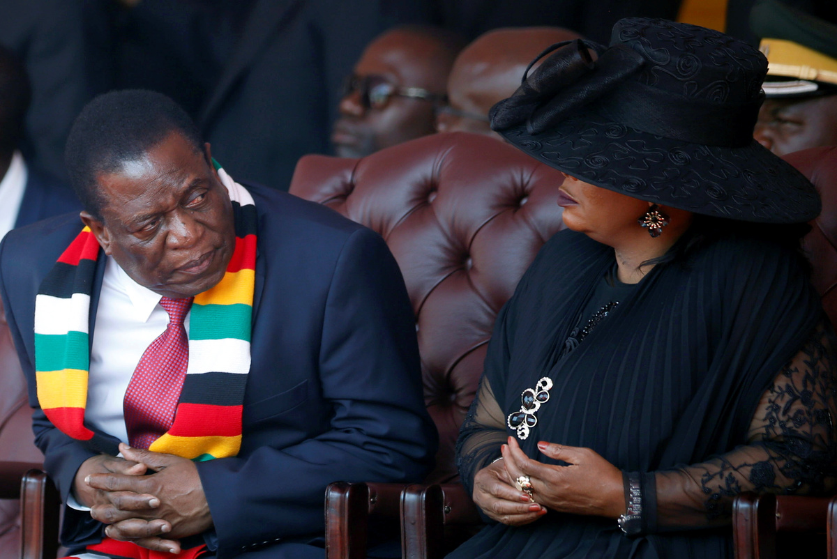 On Saturday, Mnangagwa walked behind the casket carrying Mugabe's body as it was wheeled into the centre of Harare's National Sports Stadium and placed on a podium decorated with flowers so that heads of state could say their farewells. Senior army generals and Mugabe's wife and children followed, as a brass band played.