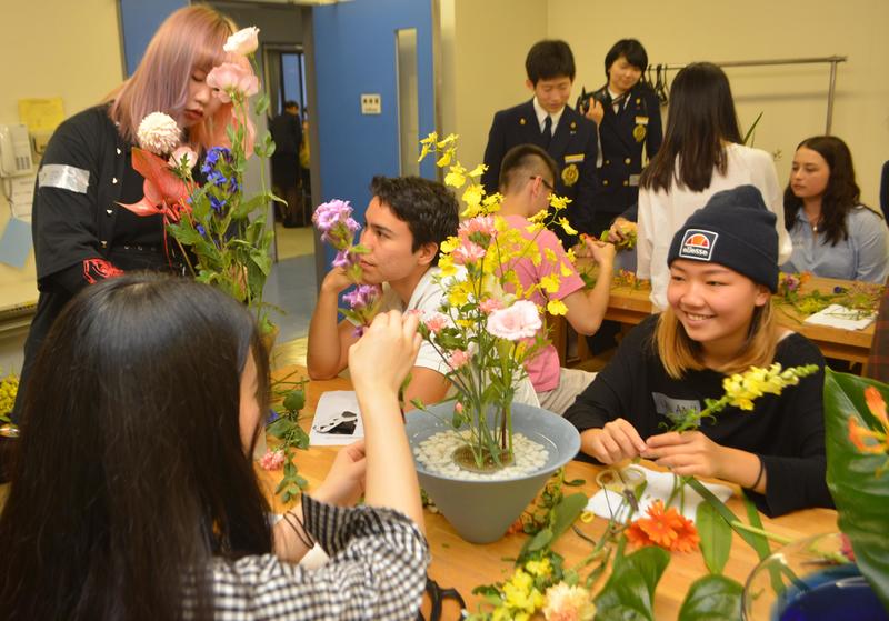 In flower arranging, students put various flowers into a kenzan, also known as a "spiky frog." "I am happy to see foreign students enjoy not only the experiences, but also talking with participants," said Marino Uezu, 20.