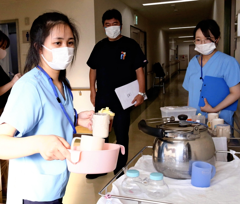 "It's hot, so be careful!" said Do Thi Thu Huong, 24, a Vietnamese woman who works as a nursing assistant. Huong was serving tea to a patient at Kokubunji Hospital in Kokubunji, Tokyo. She also thickens the tea to prevent patients accidentally breathing it in, depending on each person's condition.