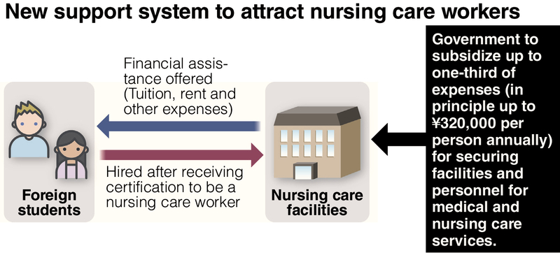 According to the plan, the government will provide financial aid -- worth about one-third of such expenses as school tuition and rent on housing -- to foreign students who aim to acquire qualifications as certified nursing care workers, with a view to improving the quality of nursing care services by aiding these facilities' efforts to secure a sufficient workforce.
