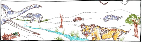 Each illustration represents a landscape from different periods of Earth’s past. It’s easy to see that living in each period would give a very different sense of what kind of animals and scenery you would consider to be “natural”.