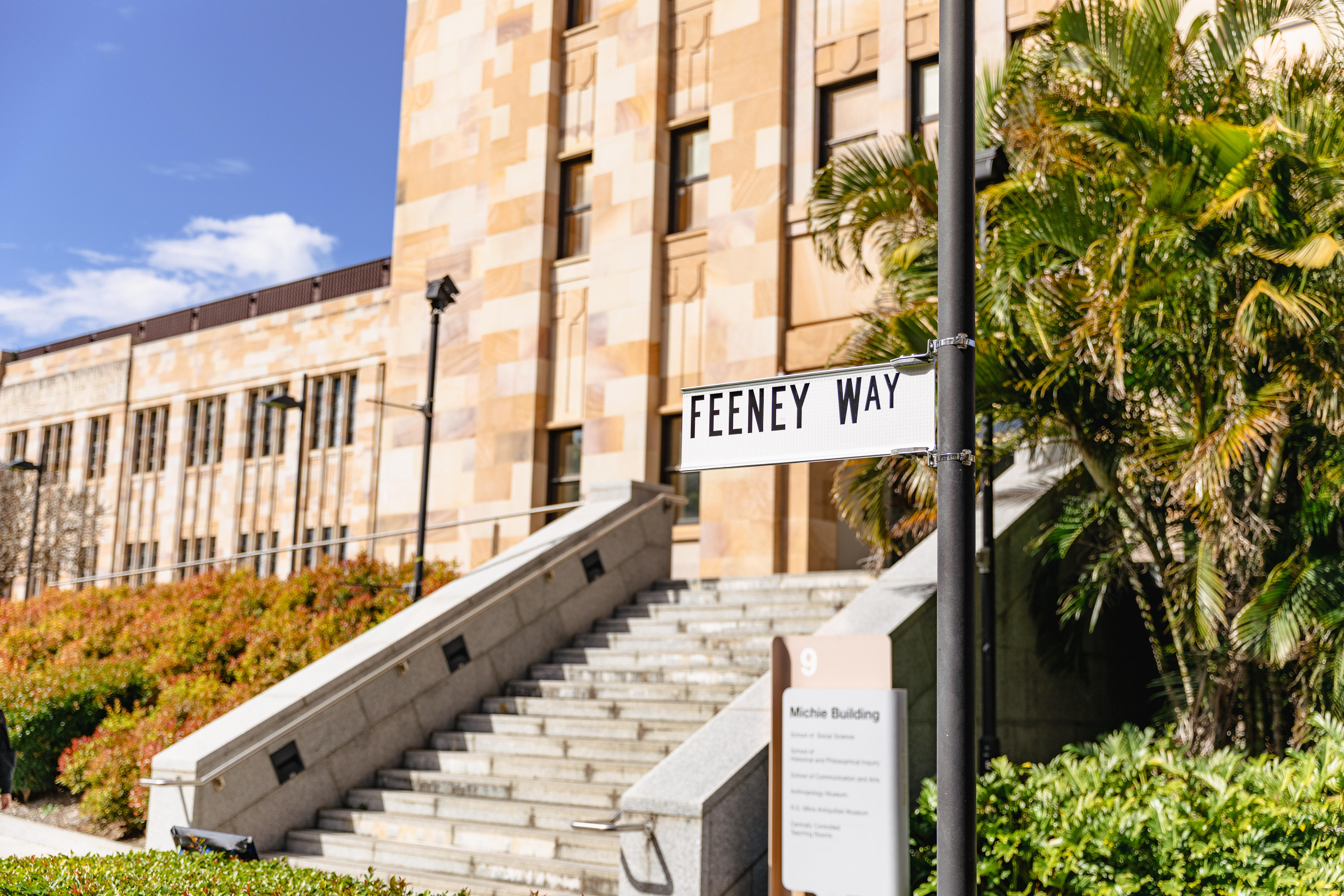 But UQ will honour his significant contribution to Queensland research today by naming the walkway in front of its historic sandstone Michie and Forgan Smith buildings, Feeney Way.