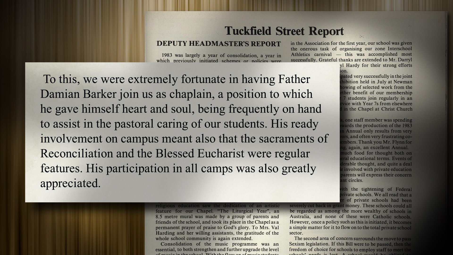 "…we are extremely fortunate in having Father Damian Barker join us as Chaplain, a position to which he gave himself heart and soul, being frequently on hand to assist in the pastoral caring of our students," the 1983 school yearbook said.