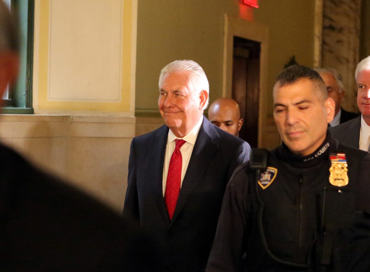 Former Exxon Mobil CEO and former U.S. Secretary of State Rex Tillerson arrives at New York State Supreme Court as an Exxon witness to testify as part of a trial in a lawsuit by New York's attorney general accusing the oil company of misleading investors about the risks of climate change regulations to its business in Manhattan, New York, U.S., October 30, 2019. REUTERS/Mike SegarFormer Exxon Mobil CEO and former U.S. Secretary of State Rex Tillerson arrives at New York State Supreme Court as an Exxon witness to testify as part of a trial in a lawsuit by New York's attorney general accusing the oil company of misleading investors about the risks of climate change regulations to its business in Manhattan, New York, U.S., October 30, 2019. REUTERS/Mike SegarFormer Exxon Mobil CEO and former U.S. Secretary of State Rex Tillerson arrives at New York State Supreme Court as an Exxon witness to testify as part of a trial in a lawsuit by New York's attorney general accusing the oil company of misleading investors about the risks of climate change regulations to its business in Manhattan, New York, U.S., October 30, 2019. REUTERS/Mike SegarFILE PHOTO: Outgoing U.S. Secretary of State Rex Tillerson speaks to the media at the U.S. State Department after being fired by President Donald Trump in Washington, U.S. March 13, 2018. REUTERS/Leah Millis/File PhotoTheodore Wells, a lawyer for Exxon Mobil, exits the New York State Supreme Court in the Manhattan borough of New York City, U.S., October 23, 2019. REUTERS/Eduardo Munoz