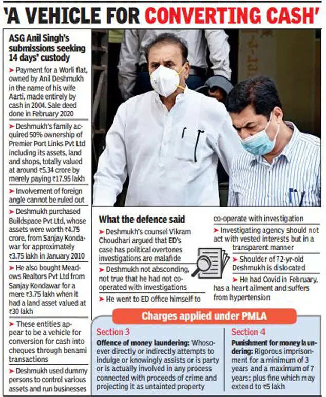 MUMBAI: A few hours after the post-midnight arrest of former state home minister Anil Deshmukh (72), the Enforcement Directorate produced him before a special holiday court on Tuesday, stating he was the key person in the Rs 100 crore money laundering case and the agency needed to investigate a “foreign angle” in the case apart from establishing the money trail.