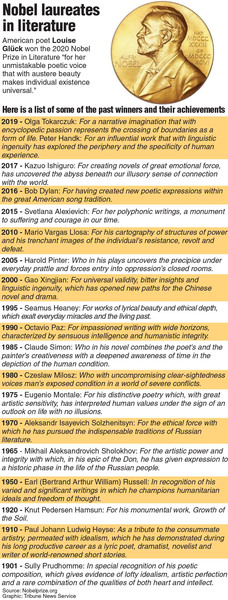 Gluck, 77, joins a glittering list of literary giants and previous Nobelists who include, in this century, Canadian short-story master Alice Munro, British novelist Kazuo Ishiguro, Chinese magical-realist Mo Yan, Peruvian writer Mario Vargas Llosa and Turkish author Orhan Pamuk.