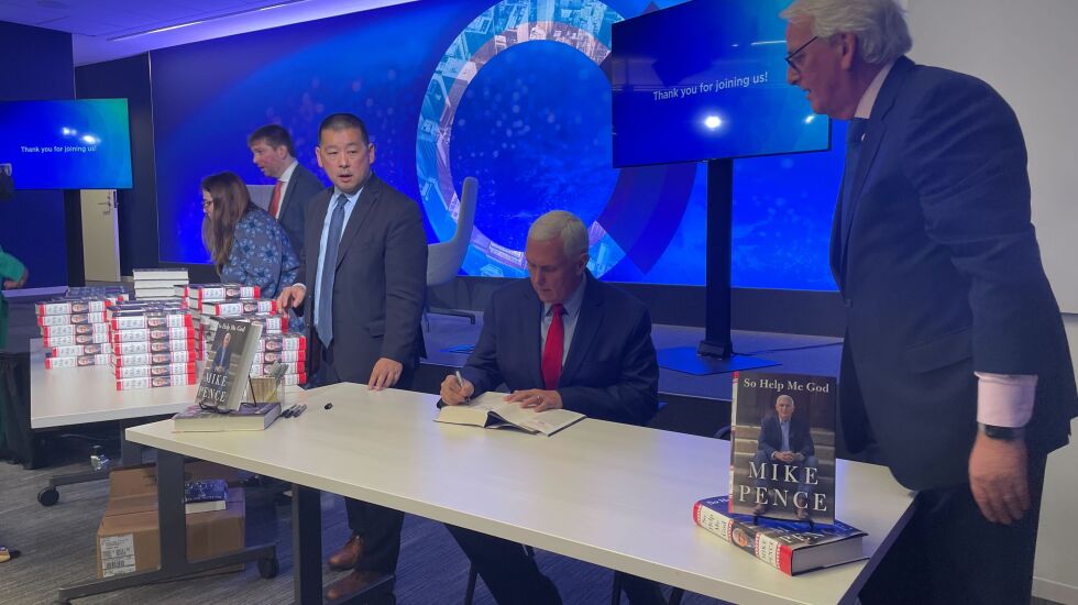 The former vice president, in Chicago to promote his new memoir, “So Help Me God,” hasn’t ruled out a 2024 run.