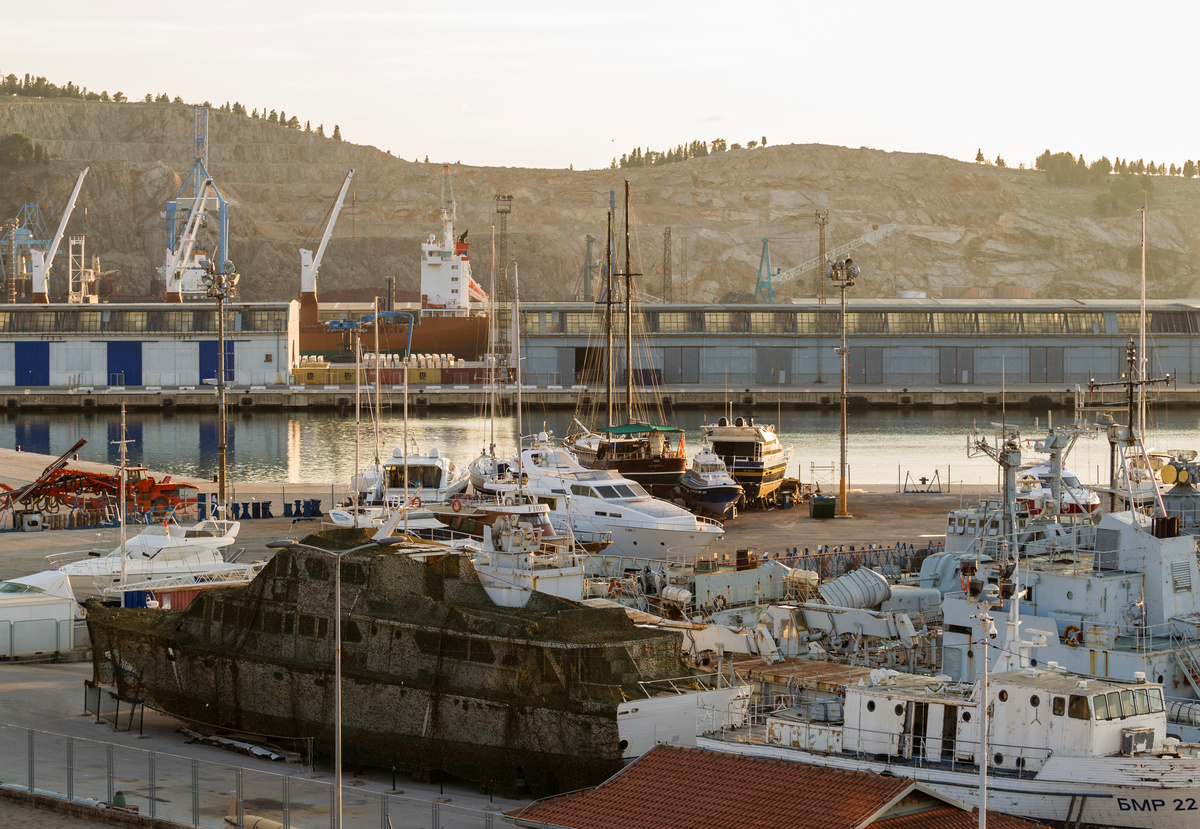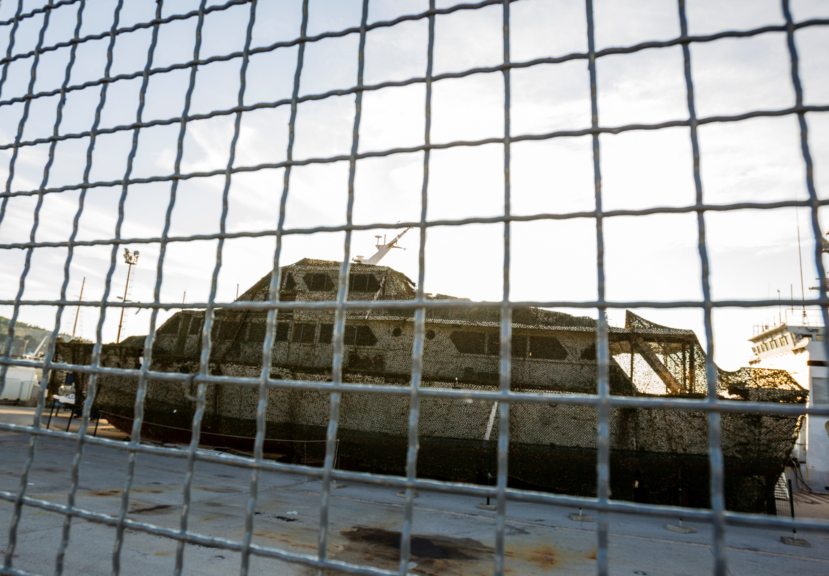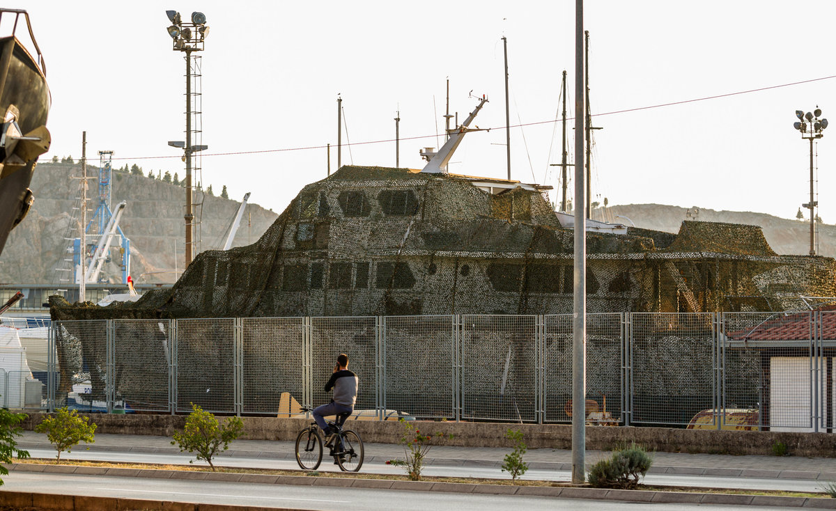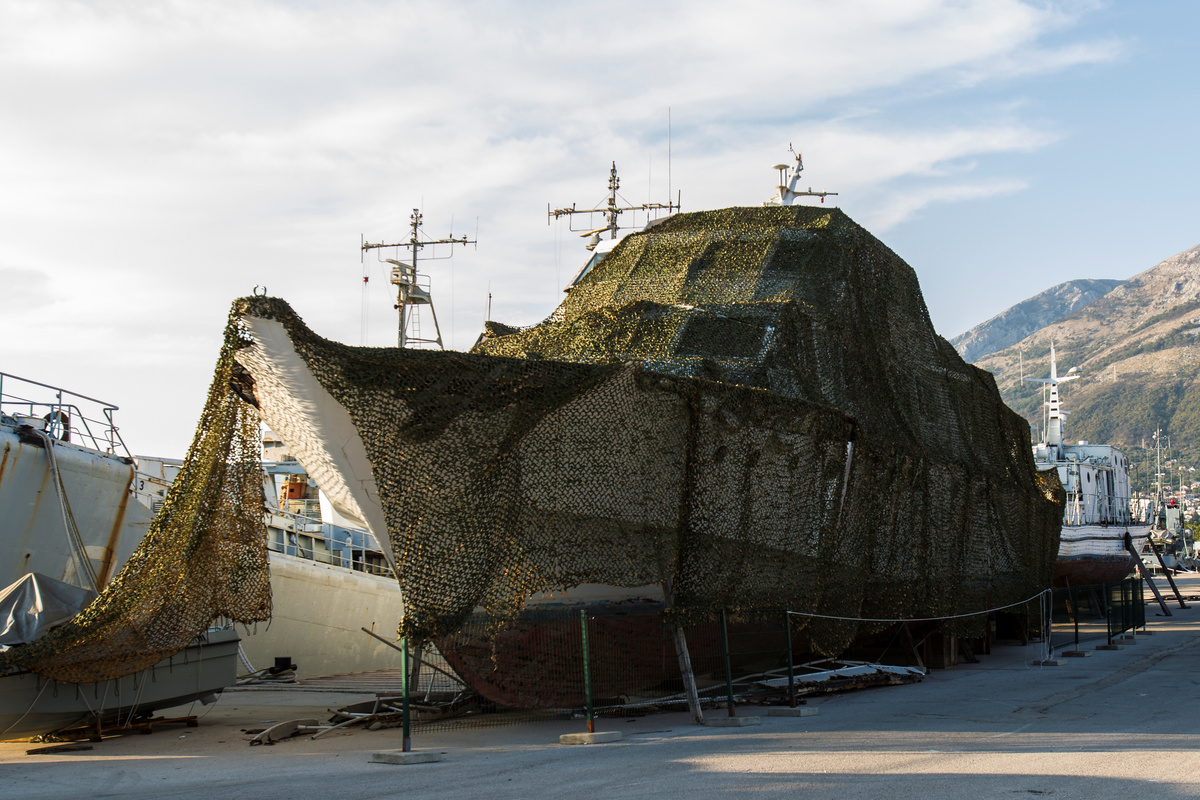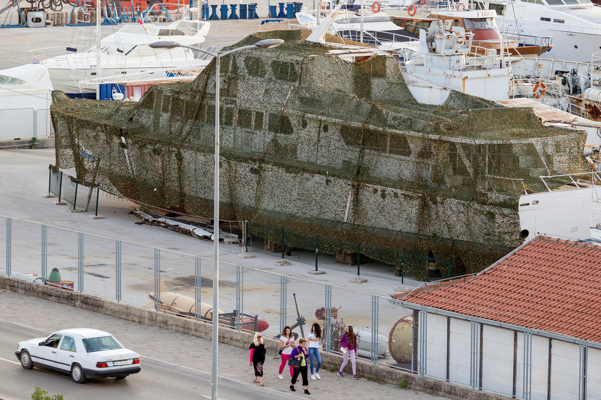 The wooden ship was dry docked in 2017 for repairs in Montenegro's port of Bar. She remains there, partly hidden by a camouflage net, with her hull riddled with cracks and peeling white paint.
