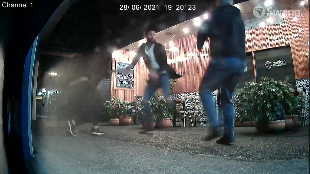 The brawl was captured on CCTV and broke out when a man and woman were asked to leave the Forster restaurant for allegedly not wearing masks indoors or checking in using the QR code.