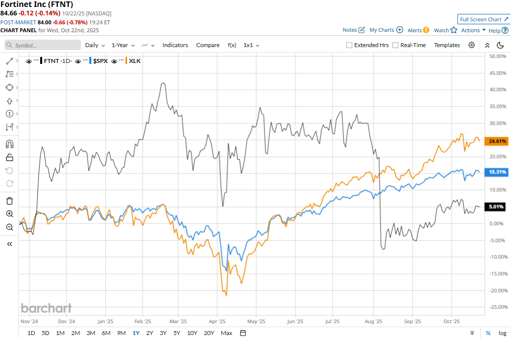 FTNT stock prices have observed a modest 2.7% uptick over the past 52 weeks, notably underperforming the Technology Select Sector SPDR Fund’s (XLK) 23.2% gains and the S&P 500 Index’s ($SPX) 14.5% returns during the same time frame.