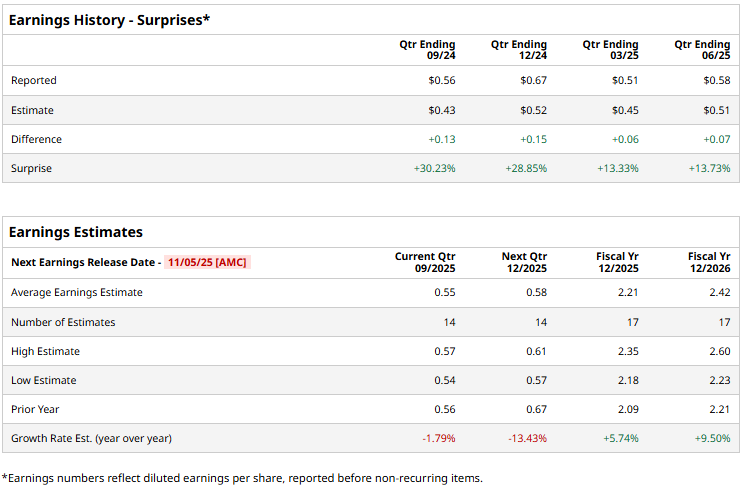 The cybersecurity giant is set to unveil its third-quarter results after the market closes on Wednesday, Nov. 5. Ahead of the event, analysts expect FTNT to report non-GAAP profit of $0.55 per share, down 1.8% from $0.56 per share reported in the year-ago quarter. On a positive note, the company has surpassed Wall Street’s earnings projections in each of the past four quarters by substantial margins.