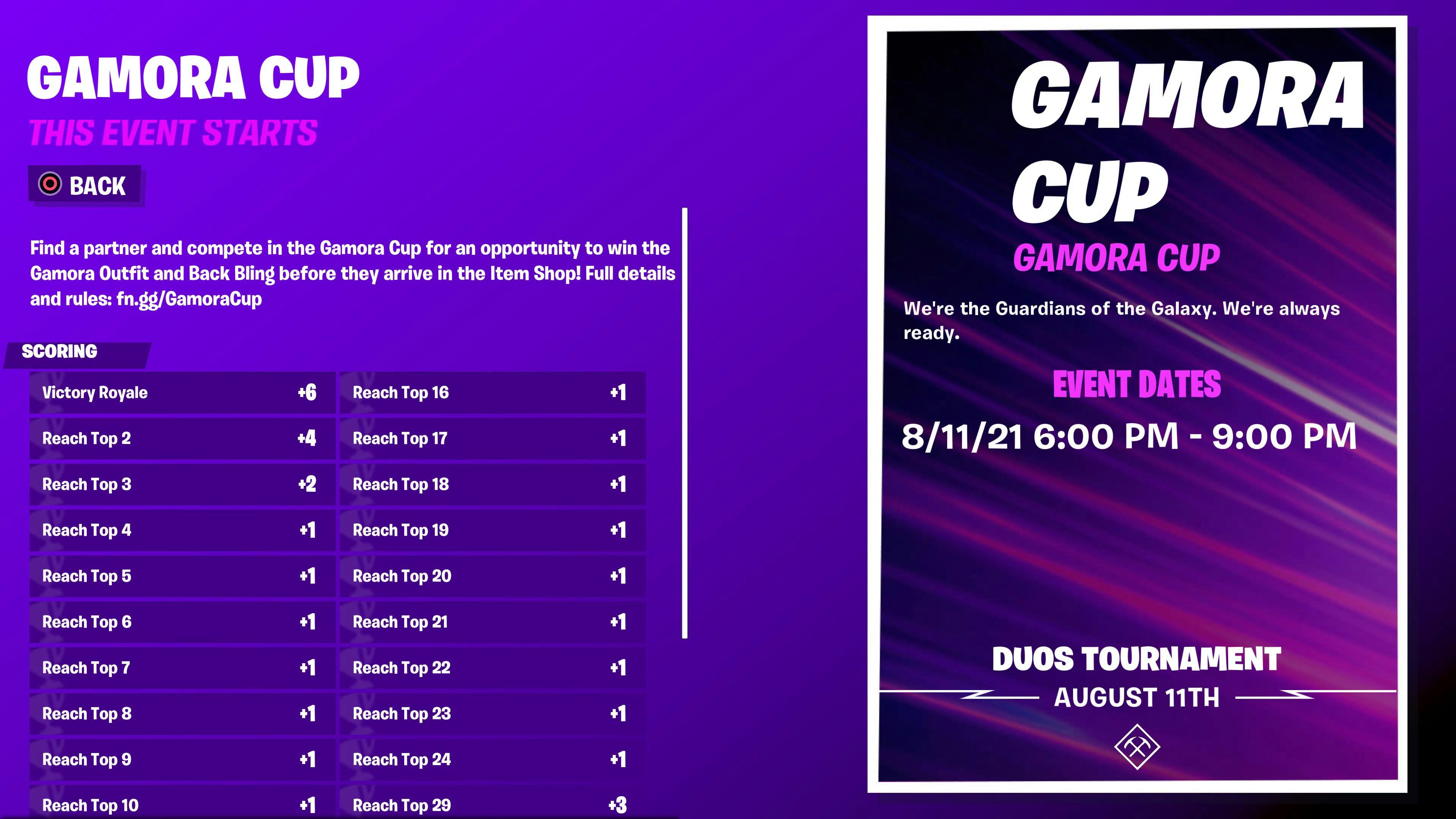 The prizing for the Gamora Cup includes a bundle featuring the Gamora Outfit and Gamora’s Cloak Back Bling. In addition, duos who score at least eight points during the Cup will also get the Daughter of Thanos Spray.