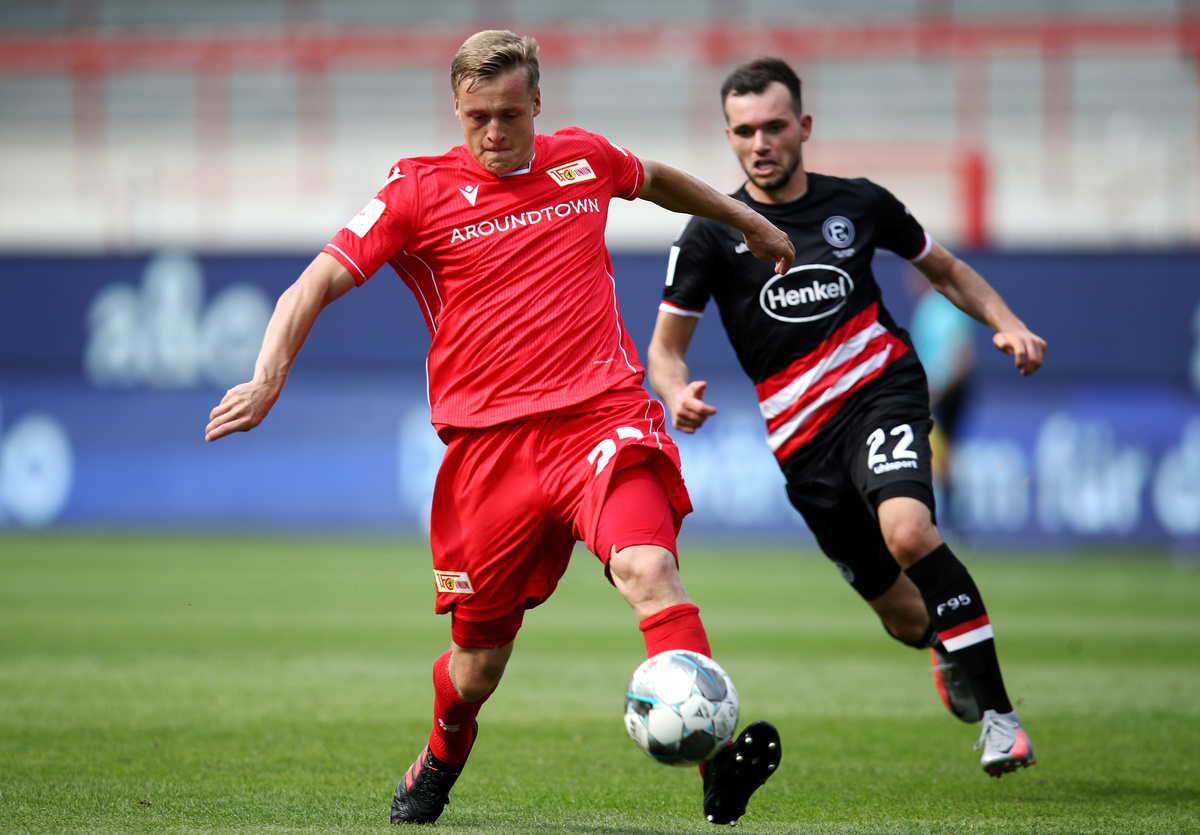 Soccer Football - Bundesliga - 1. FC Union Berlin v Fortuna Dusseldorf - Stadion An der Alten Forsterei, Berlin, Germany - June 27, 2020 Union's Felix Kroos in action with Fortuna Dusseldorf 's Kevin Stoger, following the resumption of play behind closed doors after the outbreak of the coronavirus disease (COVID-19) Maja Hitij/Pool via REUTERS DFL regulations prohibit any use of photographs as image sequences and/or quasi-video