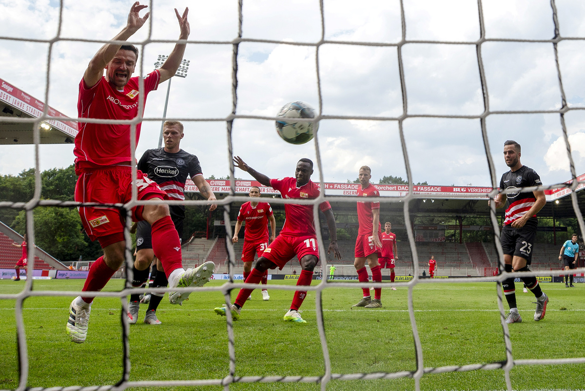 Soccer Football - Bundesliga - 1. FC Union Berlin v Fortuna Dusseldorf - Stadion An der Alten Forsterei, Berlin, Germany - June 27, 2020 Union's Anthony Ujah scores their first goal, following the resumption of play behind closed doors after the outbreak of the coronavirus disease (COVID-19) Maja Hitij/Pool via REUTERS DFL regulations prohibit any use of photographs as image sequences and/or quasi-video
