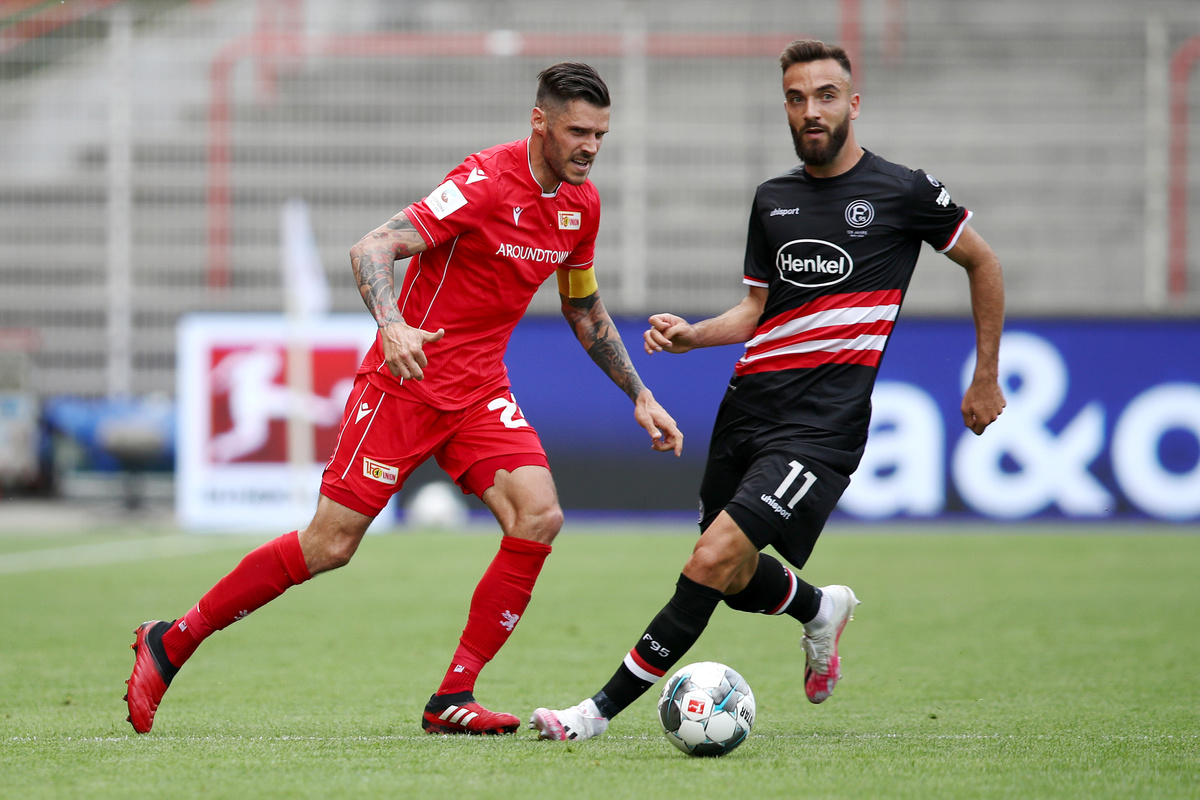 Soccer Football - Bundesliga - 1. FC Union Berlin v Fortuna Dusseldorf - Stadion An der Alten Forsterei, Berlin, Germany - June 27, 2020 Union's Christopher Trimmel in action with Fortuna Dusseldorf 's Kenan Karaman, following the resumption of play behind closed doors after the outbreak of the coronavirus disease (COVID-19) Maja Hitij/Pool via REUTERS DFL regulations prohibit any use of photographs as image sequences and/or quasi-video