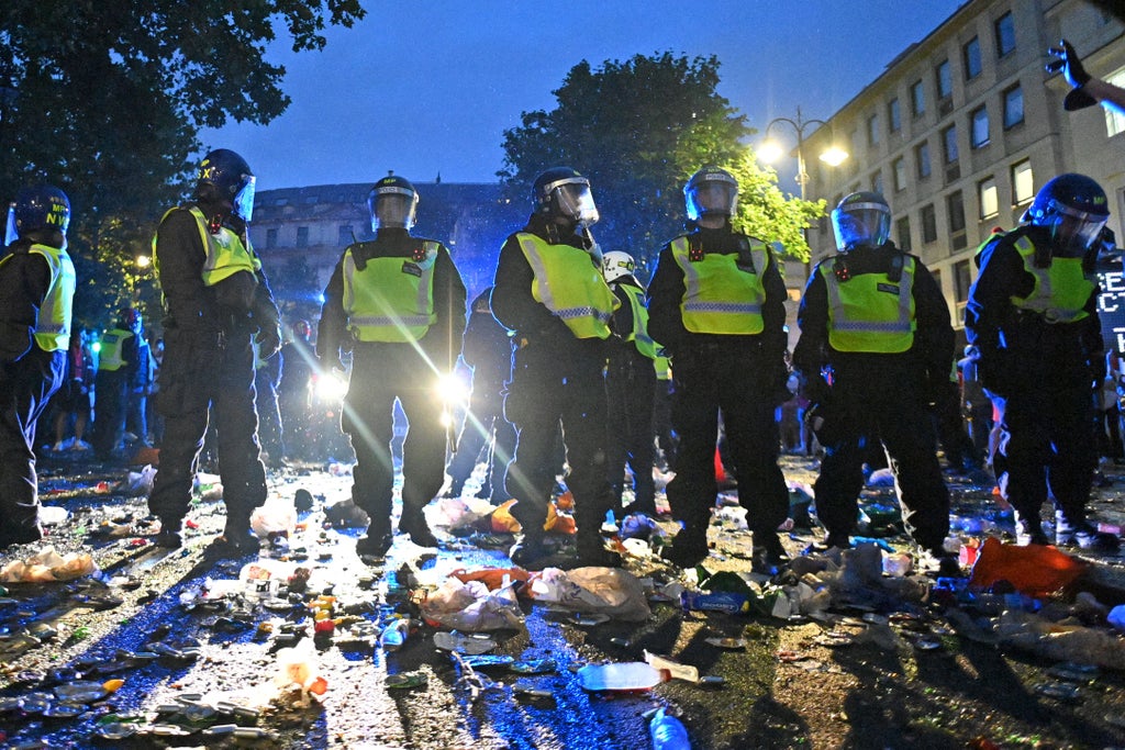 Crowds of fans swarmed London on Sunday with scuffles breaking out in Leicester Square. Bottles and cones were also hurled across the area, hitting other fans, while parts of central London were left littered with rubbish.
