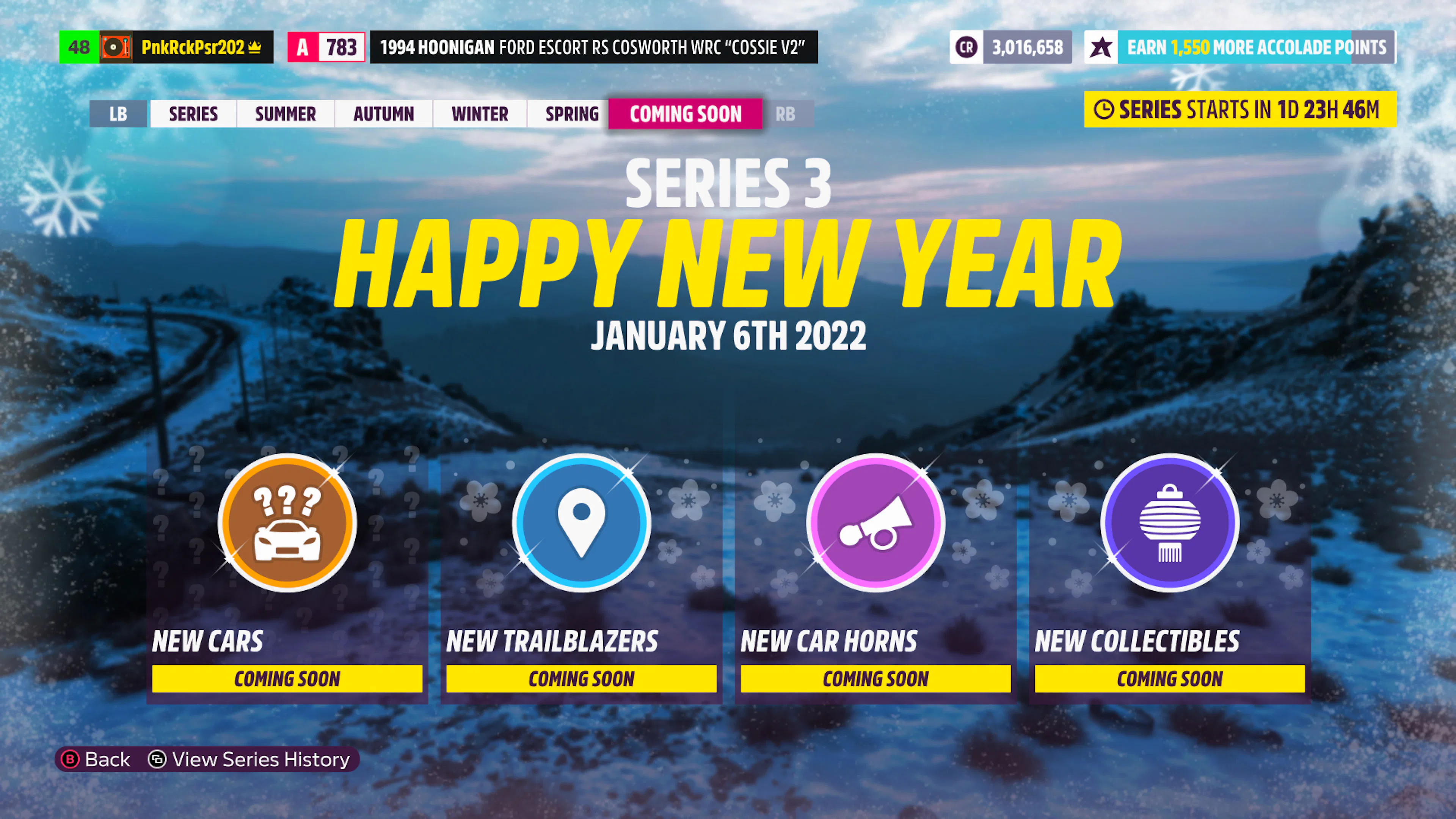 According to the in-game countdown timer on the Horizon Playlist, Forza Horizon 5 Series 3 is expected to begin at 9:30 a.m. Eastern on January 6. It’s possible the timing may be adjusted slightly as that start time approaches, but, given how close we are to launch, we imagine the content is fairly locked in by now.