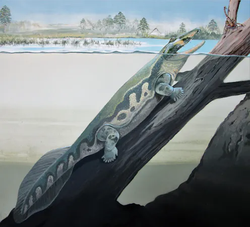 Some of our ancestors had four legs, a finned tail and lived in water. They were aquatic tetrapods which, after the end of the Devonian period 359 million years ago, increasingly moved onto the land. These land dwellers were the ancestors of all amphibians, reptiles, birds and mammals.