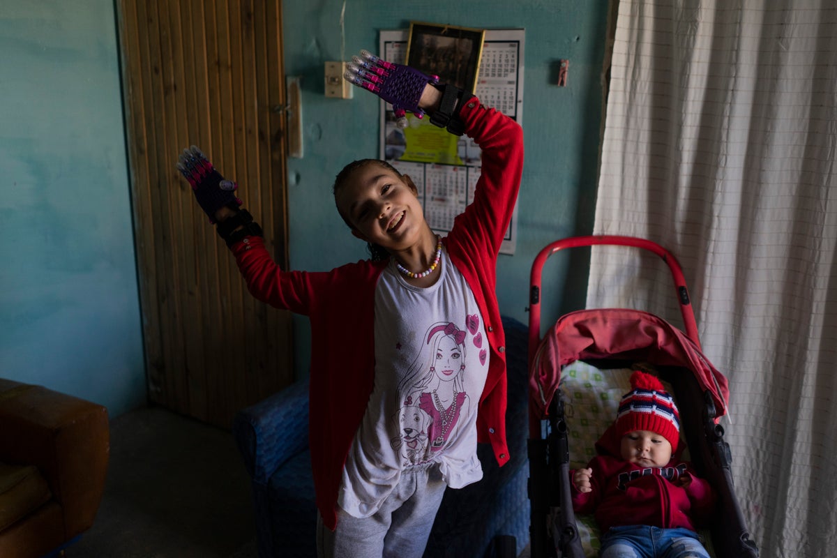 Rodríguez’s prosthetic hands move with threads that are taut from the motion of her wrists. They are violet with pink, colors she says she chose because they go well together, and are decorated with unicorn decals. Other children prefer the colors of their favorite soccer club or superhero.