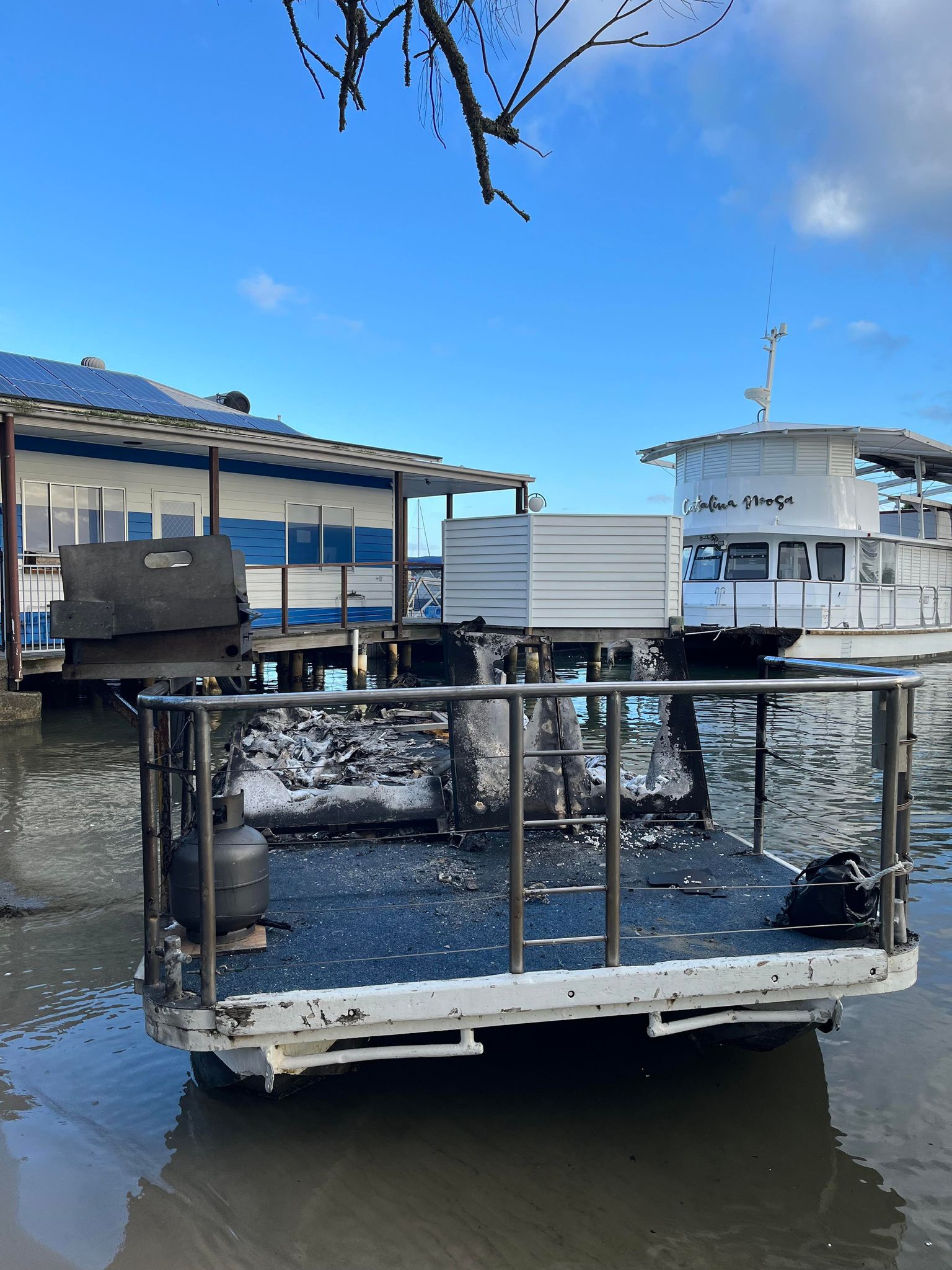 Emergency crews arrived at Gympie Terrace, at Noosaville, at about 1:30am today to find a pontoon boat and three dinghies ablaze.