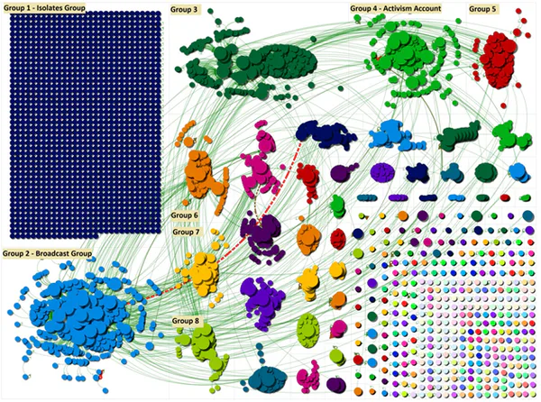 We created a social network graph (above), clustering identified different shapes and structures within the network. The largest group in the network represented an “isolates group”. These groups are typically formed when a user mentions a hashtag in their tweets without mentioning another user. Big brands, sports events, and breaking news stories will all have a sizeable isolates group. This suggests that during this time the conspiracy topic had become popular and attracted views and opinions from users who were new to the network.