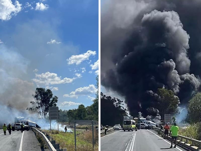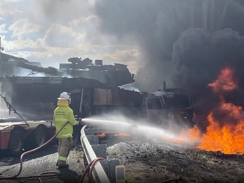 Six people are in hospital after a fiery multi-vehicle crash involving a United States army tank in central Queensland.
