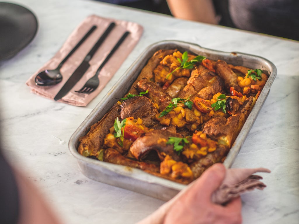 Transfer the sausages to the roasting tin along with the sun-blushed tomatoes and pour in the beef dripping. Return to the oven for 5 minutes, then carefully pour the Yorkshire batter into the tray and bake for 25 minutes.