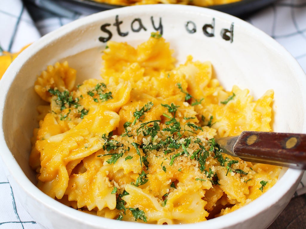 4. Blend the sauce: place the carrot mixture in a food processor, along with the reserved pasta water and blend until creamy and smooth. Pour over the pasta, mix well to coat and serve with the parsley breadcrumbs.