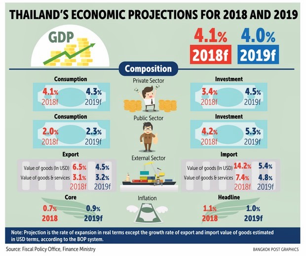 State and private investment as well as domestic spending are expected to be the main growth engines for the Thai economy in 2019, while exports should cool down to 4.5%, weighed by a dip among trade counterparts and the Sino-US dispute, said Lavaron Sangsnit, director-general of the FPO.