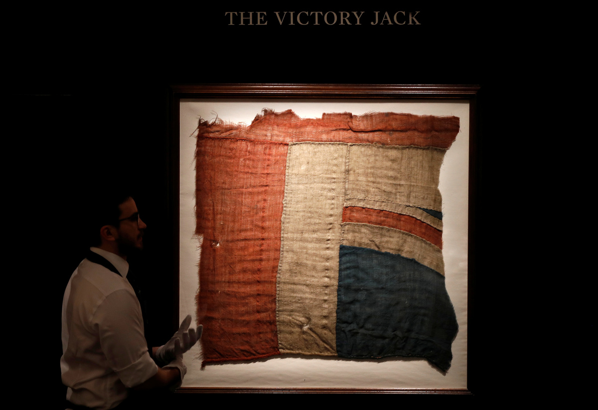 The 86 cm by 92 cm flag fragment (34 inches by 36 inches), dubbed "The Victory Jack", has an estimated price of between 80,000 and 100,000 pounds. ($108,000-$135,000)