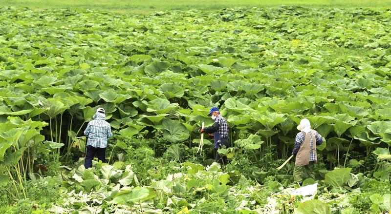 ASHORO, Hokkaido -- This year's harvest of Rawanbuki (giant Japanese butterbur) -- one of the largest types of butterbur plant in the nation that grows to over 3 meters tall and with a stem with the thickness of 10 centimeters -- has entered its peak season in this Hokkaido town.